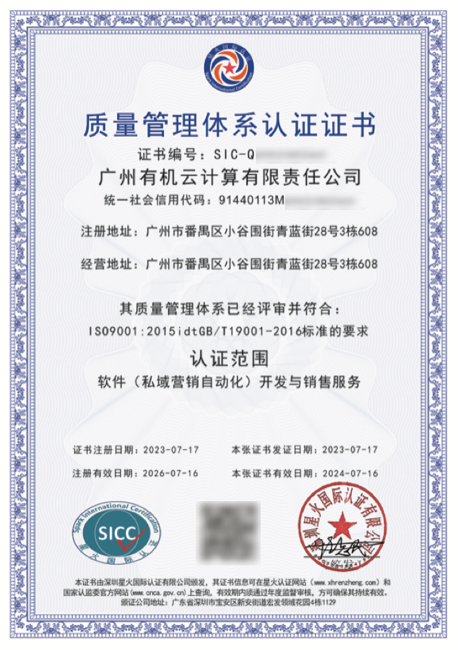 本次顺利通过ISO9001质量管理体系认证,意味着有机云的质量管理体系达到行业严苛的质量管理标准,具备为客户不断提供更高品质的产品和服务的能力!