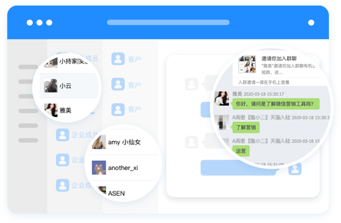 保护客户资产,采集企业成员的沟通记录备案、新增客户统计、敏感词拦截等行为。提高会话效率,构建客户画像。